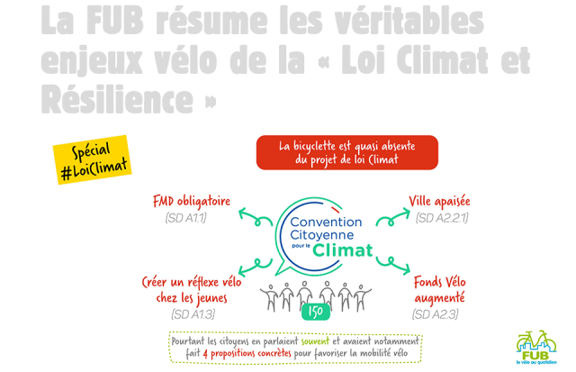 Le projet de loi « Climat et Résilience », ayant pour but de lutter contre le réchauffement climatique, sera examiné en commission à partir du 8 mars à l’Assemblée Nationale. Le mot vélo étant quasi-absent du texte, la FUB est mobilisée pour que des mesures fortes soient prises en faveur de son développement.