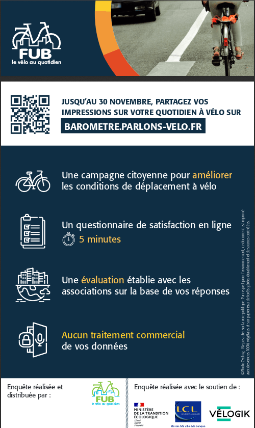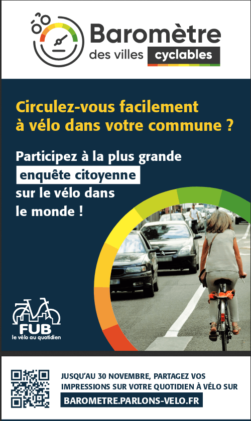 Plus nous serons nombreux à répondre, plus ce baromètre sera fiable et représentatif. Et ce sera un levier de plus pour faire avancer les aménagements cyclables dont nous, usagers, avons besoin ! L’enquête est ouverte jusqu’au 30 Novembre 2021. Vous pouvez répondre plusieurs fois à l’enquête pour plusieurs communes différentes (par exemple : votre commune de résidence et votre commune d’activité professionnelle).