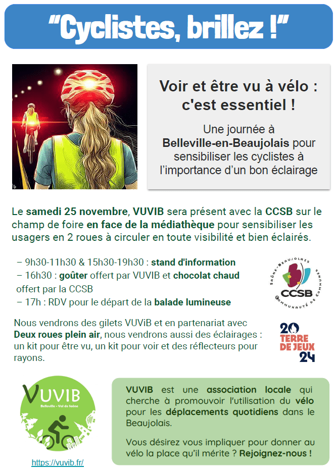 Ce moment sera également idéal pour préparer votre vélo en vue de la parade lumineuse qui aura lieu le samedi 16 novembre à 17h.