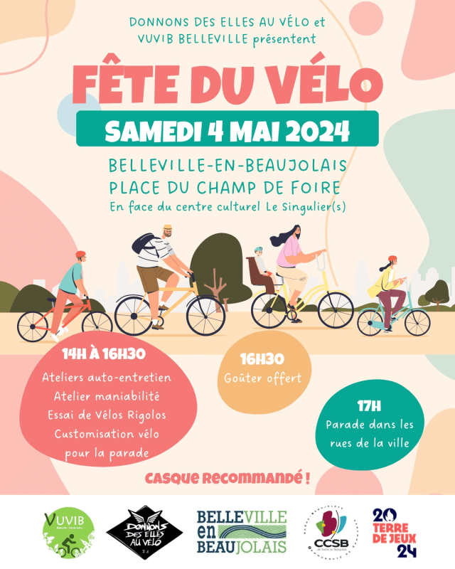 Merci à ceux qui ont rendu ces journées possibles : Service Salles et festivités / Services Techniques et plus généralement à tous les agents et élus de Belleville-en-Beaujolais et la CCSB qui nous ont aidé et soutenu. Merci à toute l’équipe du cinéma Le Singulier(s) pour l’organisation de la séance, à Saveur et Nature pour boisson et une partie du goûter. Merci à DONNONS DES ELLES AU VELO et Marie MASSAKO-CHARTRON et à tous ceux qui on participer de prêt ou de loin à la réussite de l’évènement.