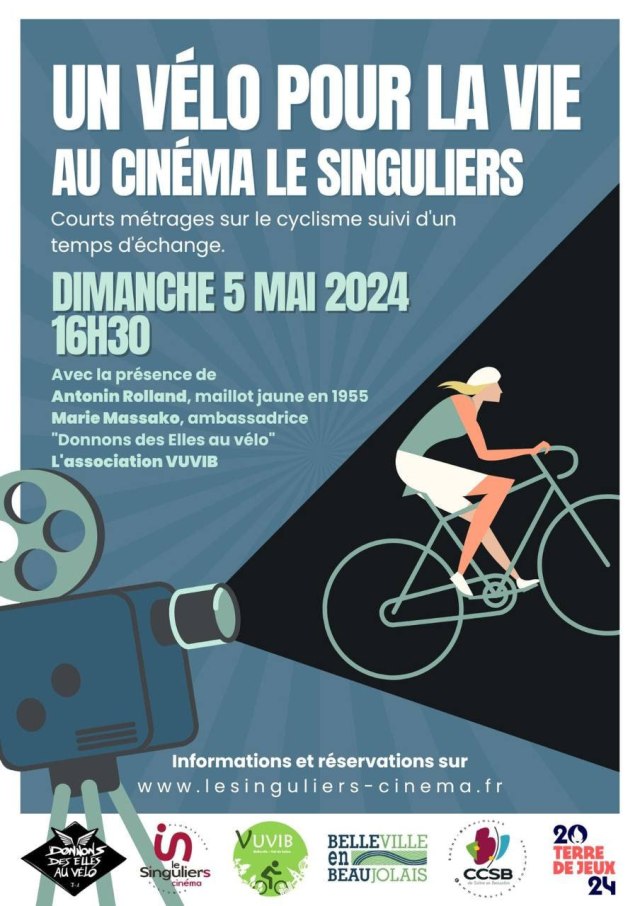 -> dimanche, + de 60 personnes se sont installées au cinéma le Singulier(s) pour la diffusion de courts métrages « Un vélo pour la vie » suivi d’un temps d’échange avec M. Antonin Roland qui a porté 12 jours le maillot jaune en 1955 et plus ancien porteur du Maillot jaune à l’aube de ses 100 ans. Nous avons animé ce moment convivial pour promouvoir le sport, le cyclisme et plus particulièrement le cyclisme féminin, et la pratique du vélo au quotidien.
